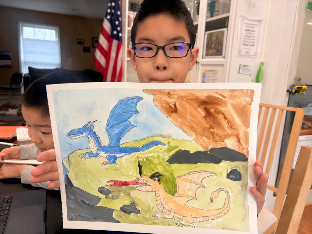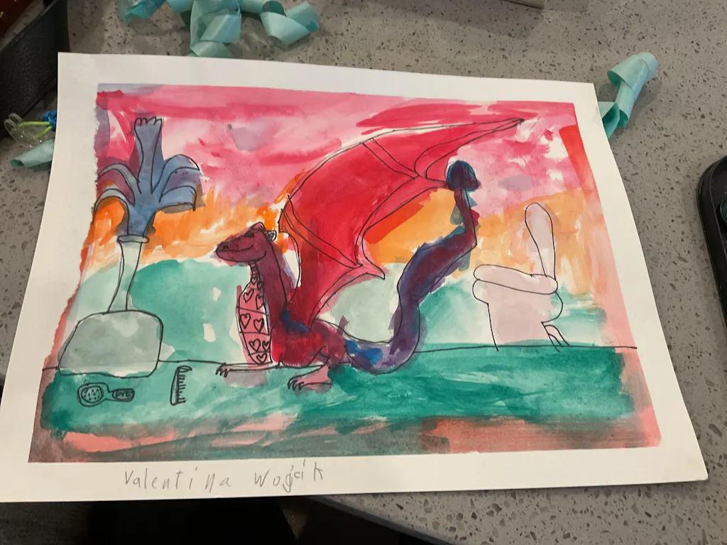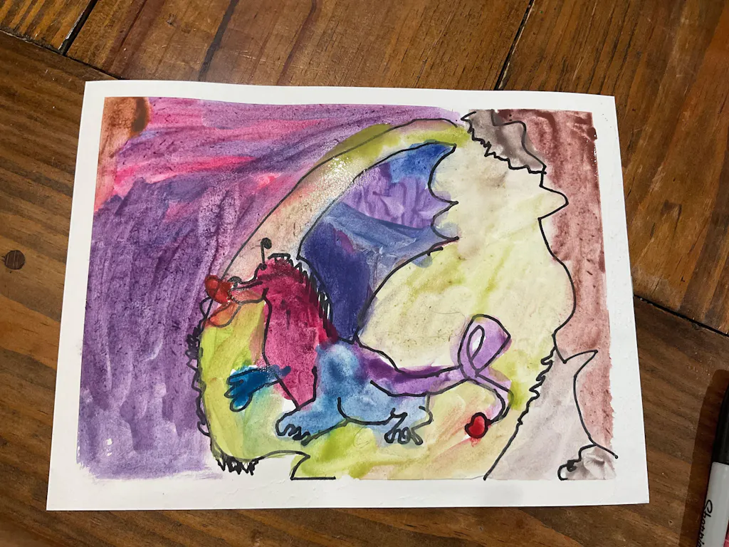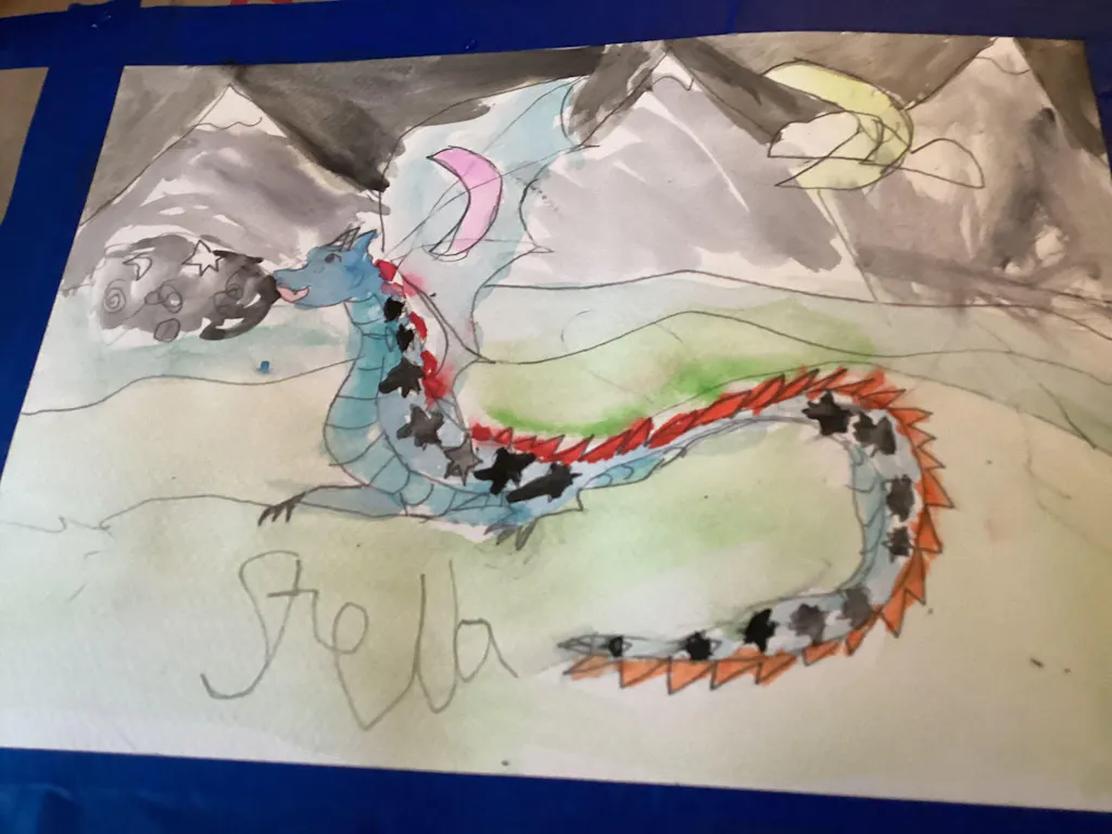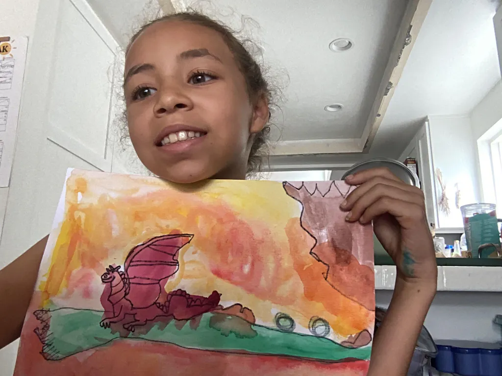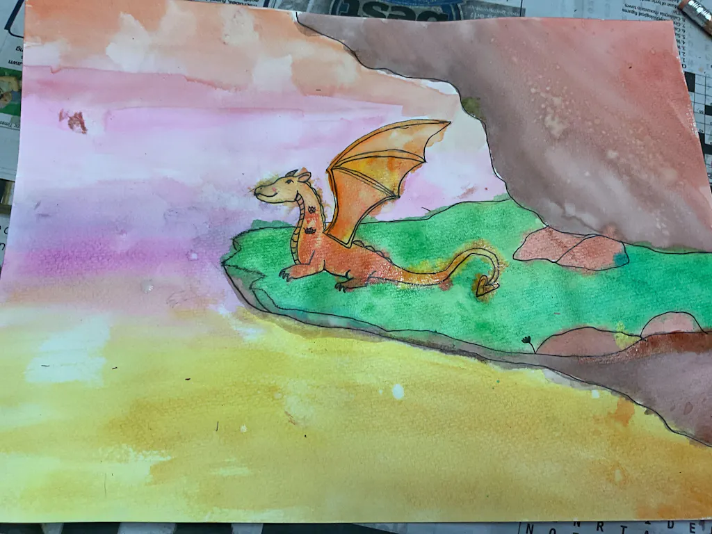 Today we are painting a Dragon and singing songs by Imagine Dragons! This lesson is a great chance to practice drawing scale-y creatures, color mixing, and the wet on wet technique 🐉