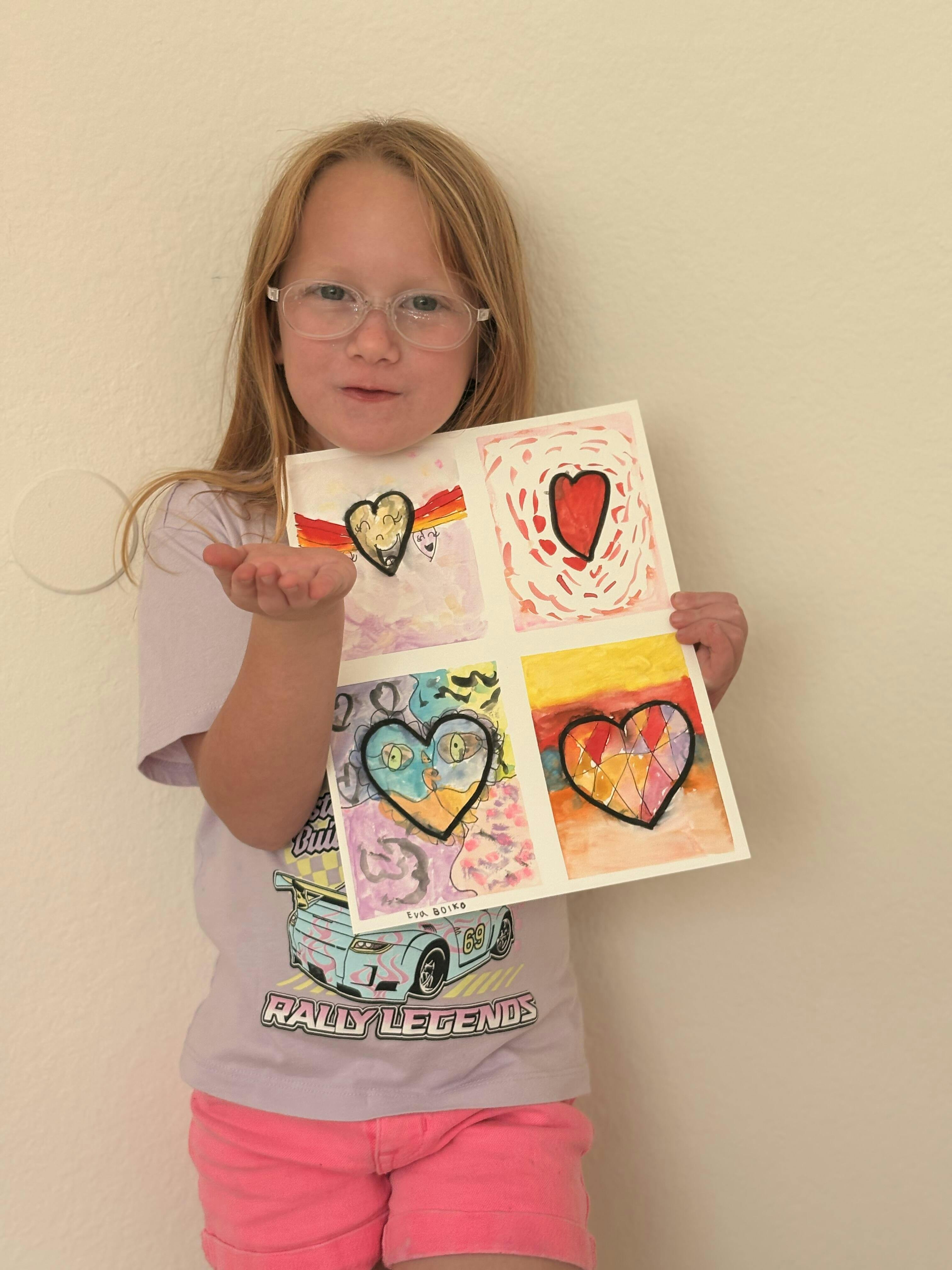 Today, we are learning how to paint hearts like four famous artists. This lesson is a great chance to practice creating color hues, drawing silly faces, and noticing different artistic styles ❤️