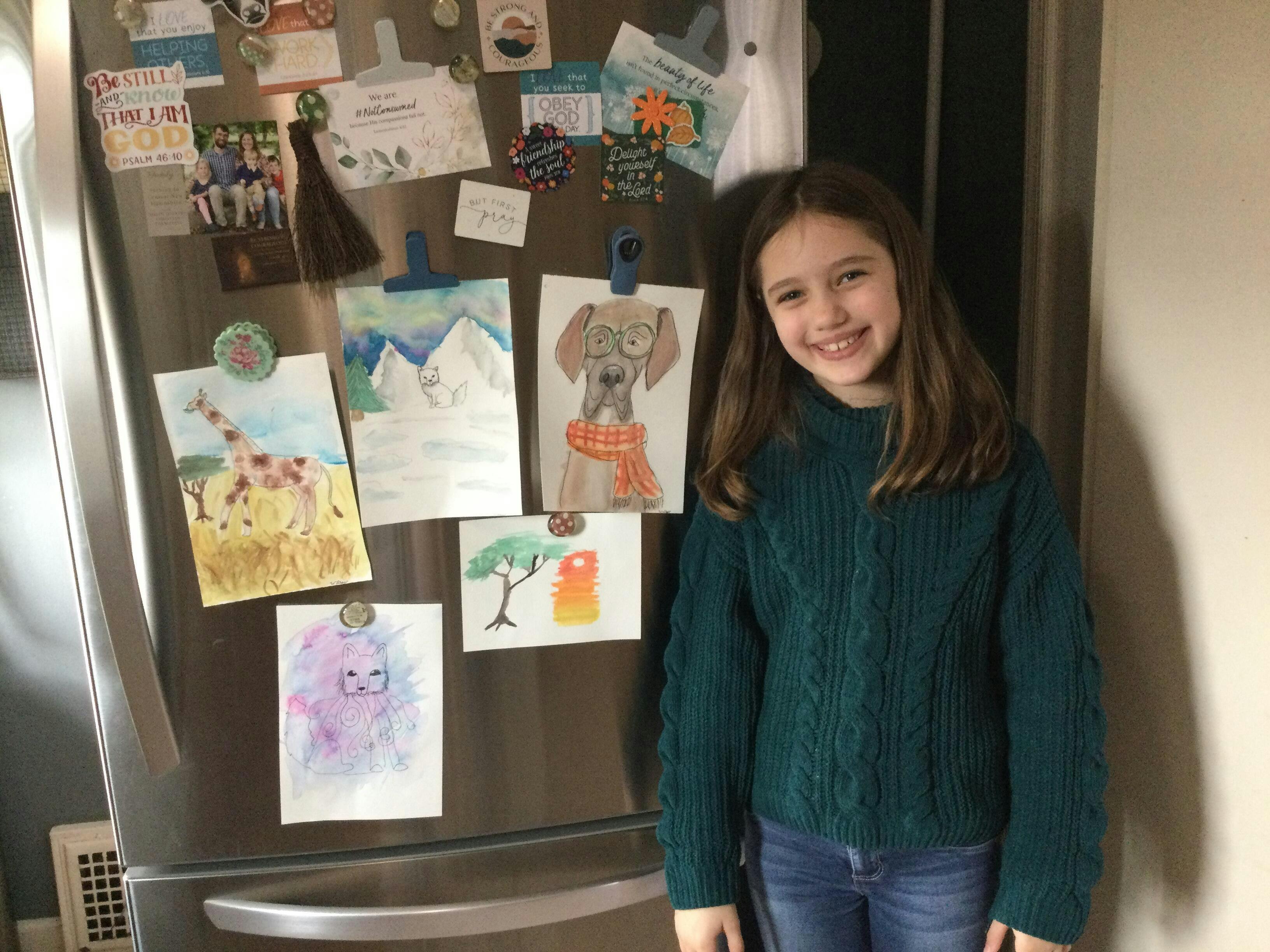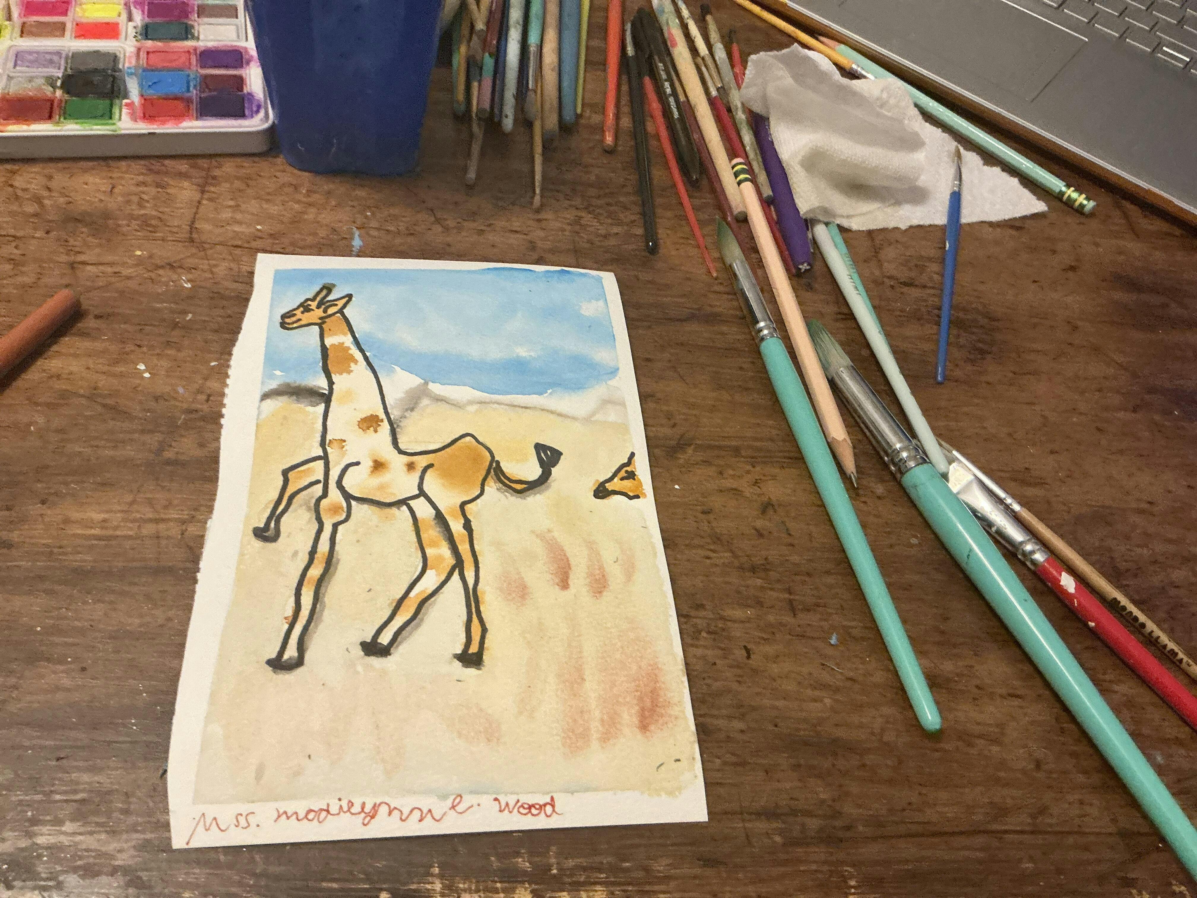 My Giraffe: Giraffes are tall and can grow up to 19 feet tall. They have long thin necks. Callie used the wet on wet technique for the sky.