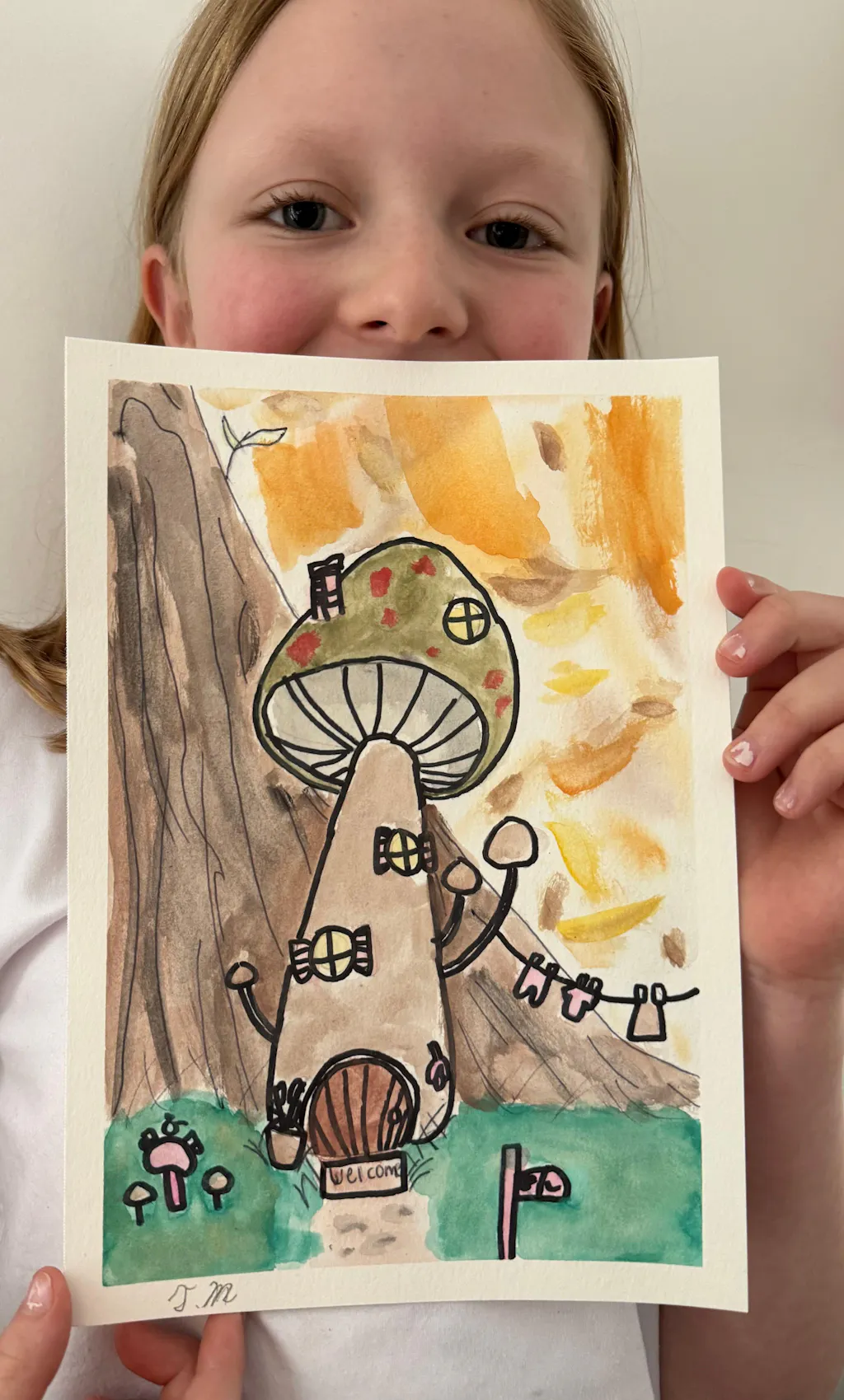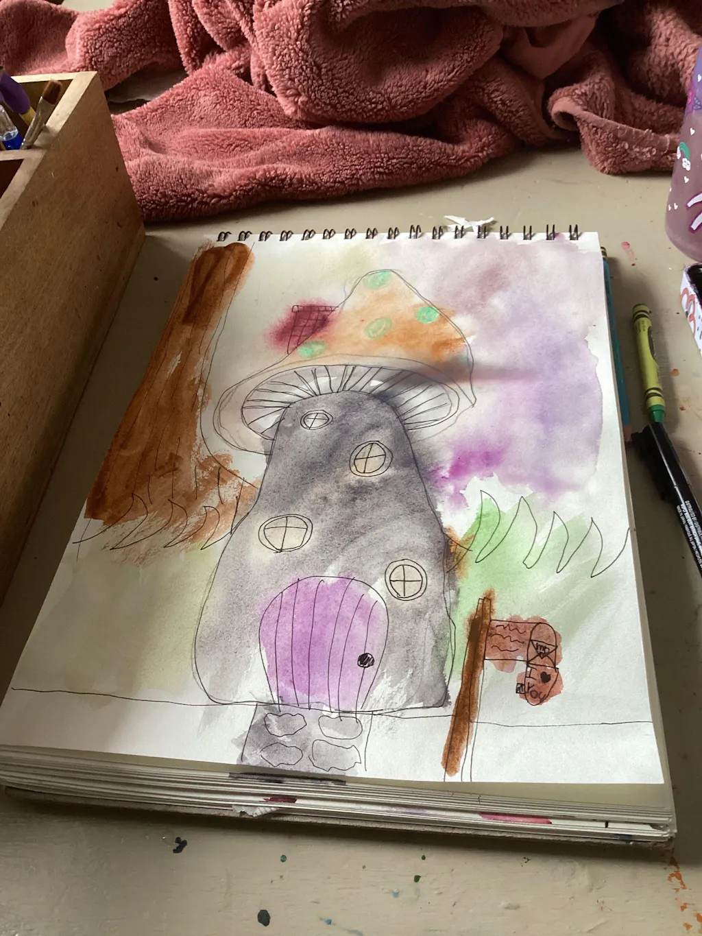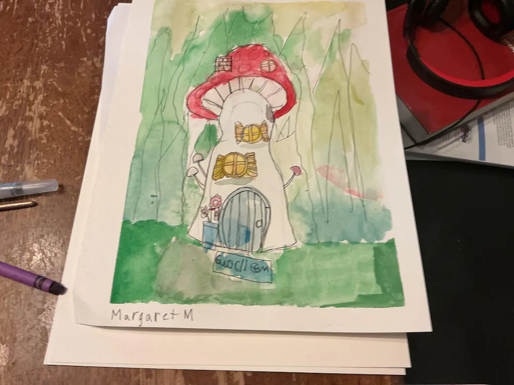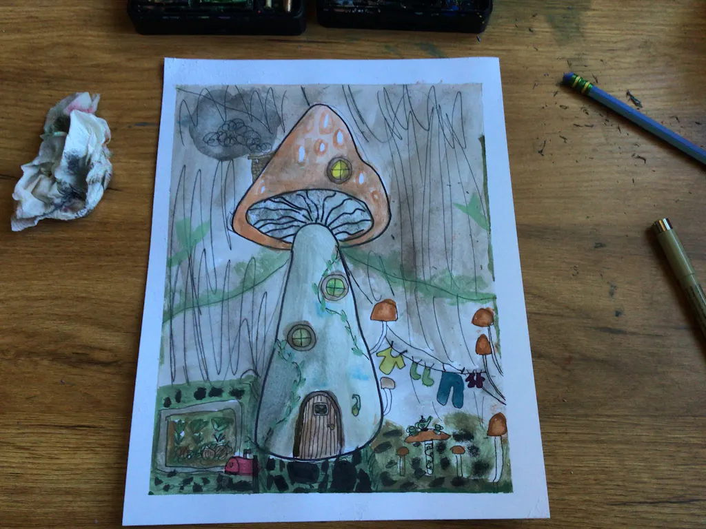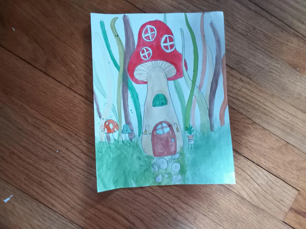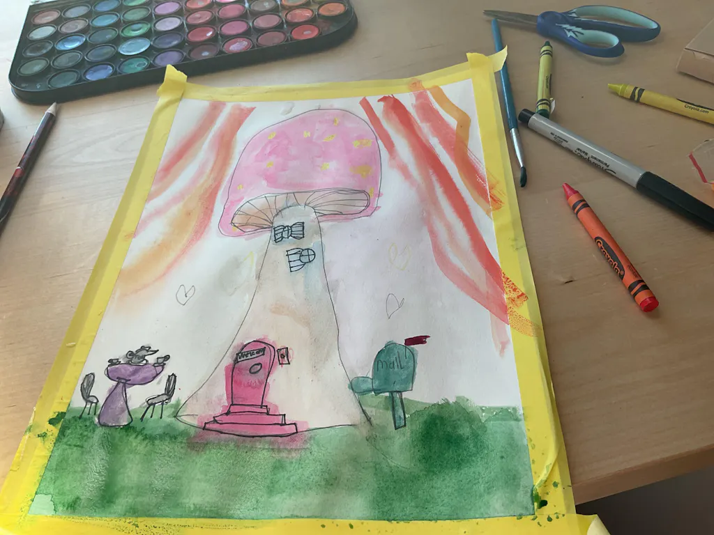 Did you know that mushrooms are more similar to animals than plants? They're called fungi and there are thousands of different types of them! In this adventure we will learn how to draw a mushroom together and it'll be up to you to transform it into a magical cozy home. This lesson is a great chance to practice the wax resist technique to create spots using crayons 🍄🟫 🍄