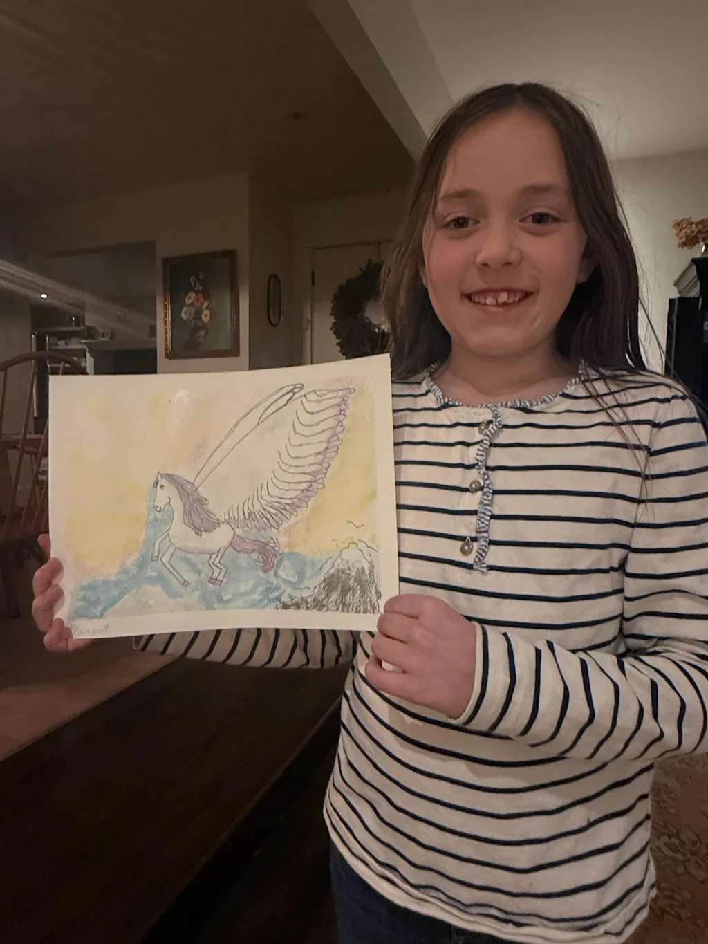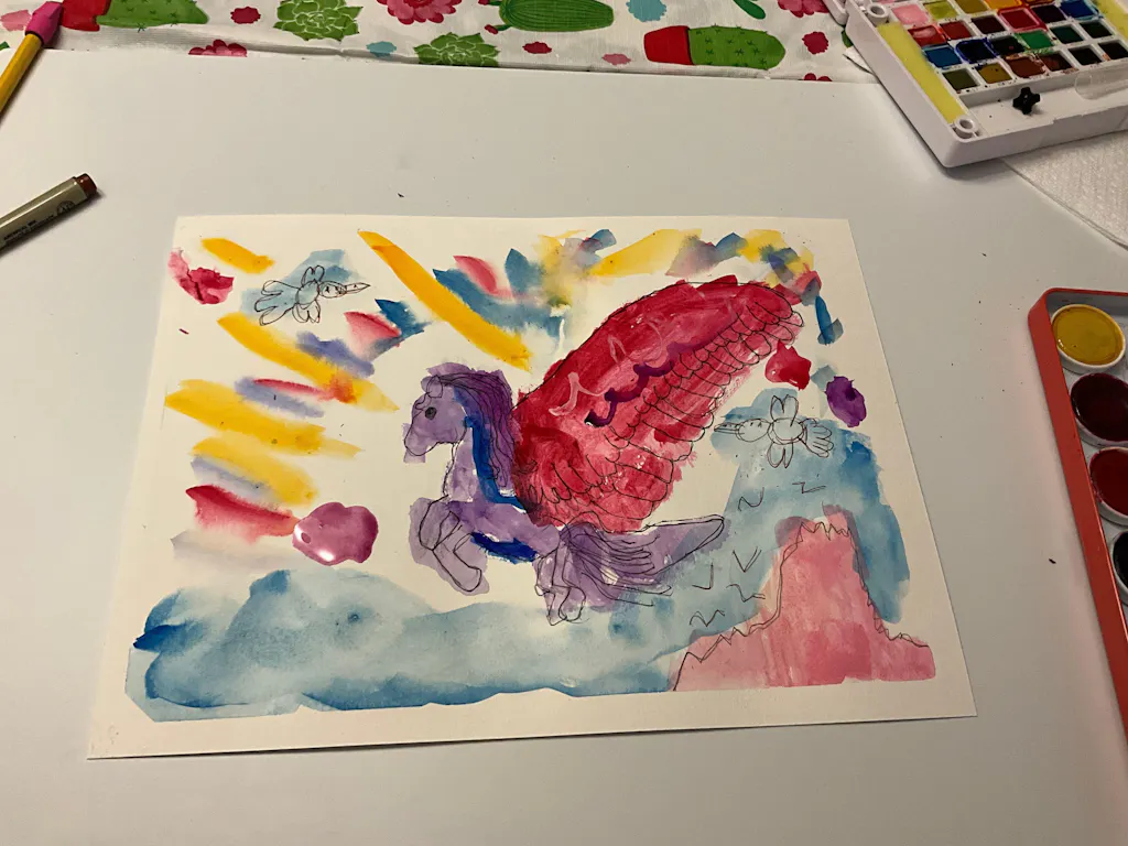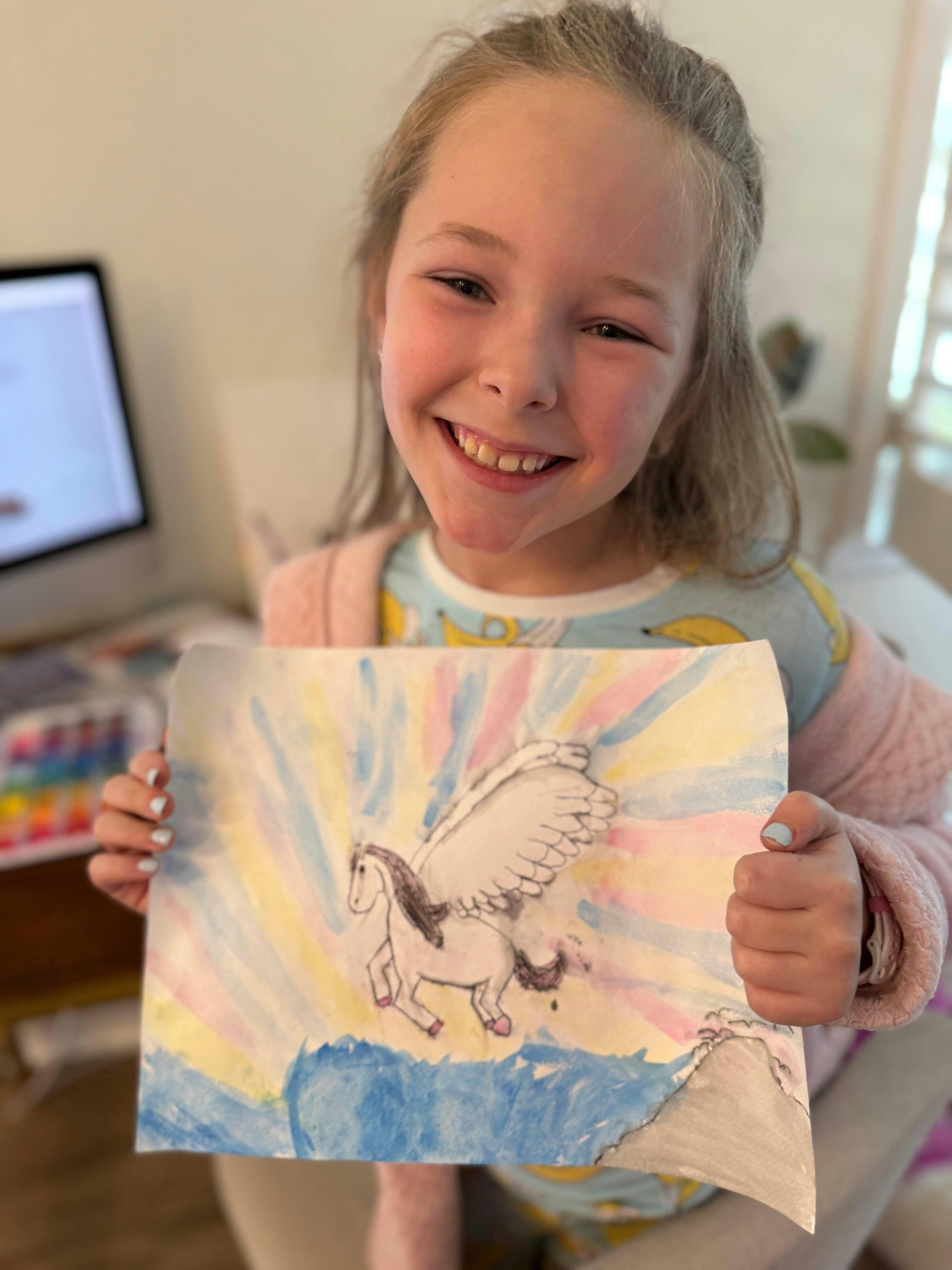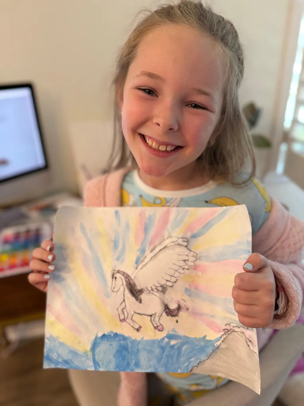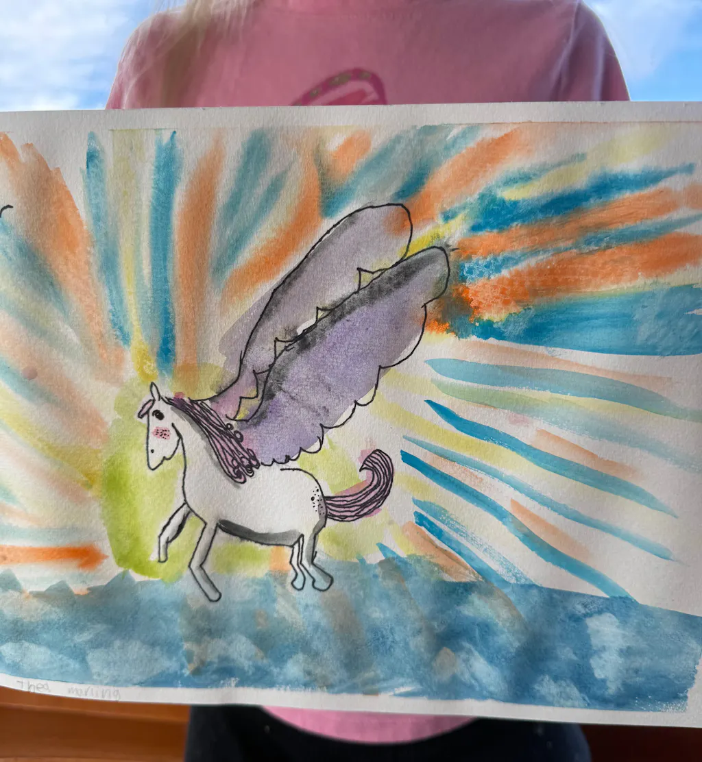 In this adventure, we'll learn all about the magical flying horse from Greek mythology, Pegasus! This is a great chance to practice blending to paint the sky full of sunbeams, as well as how to use a Sharpie and add shadows to really make your horse stand out.