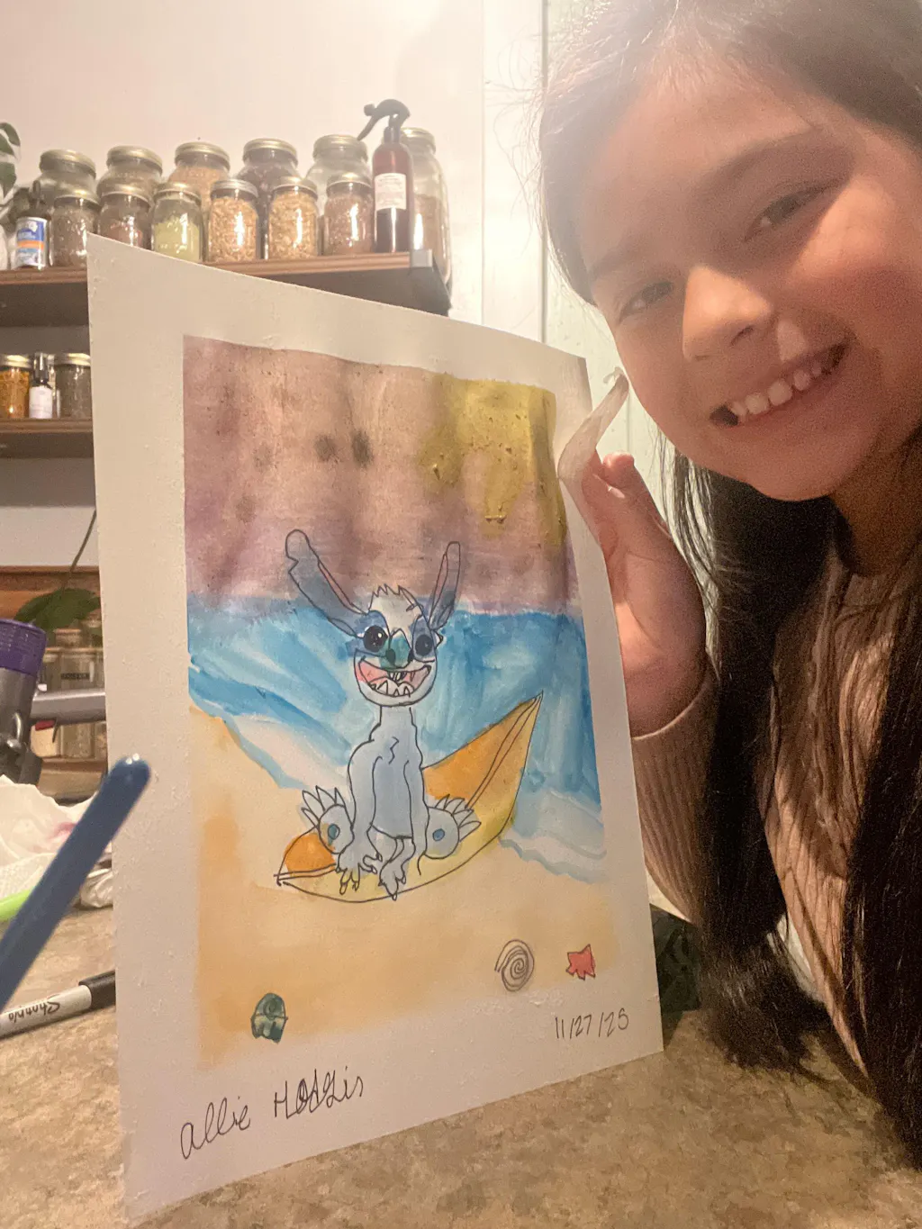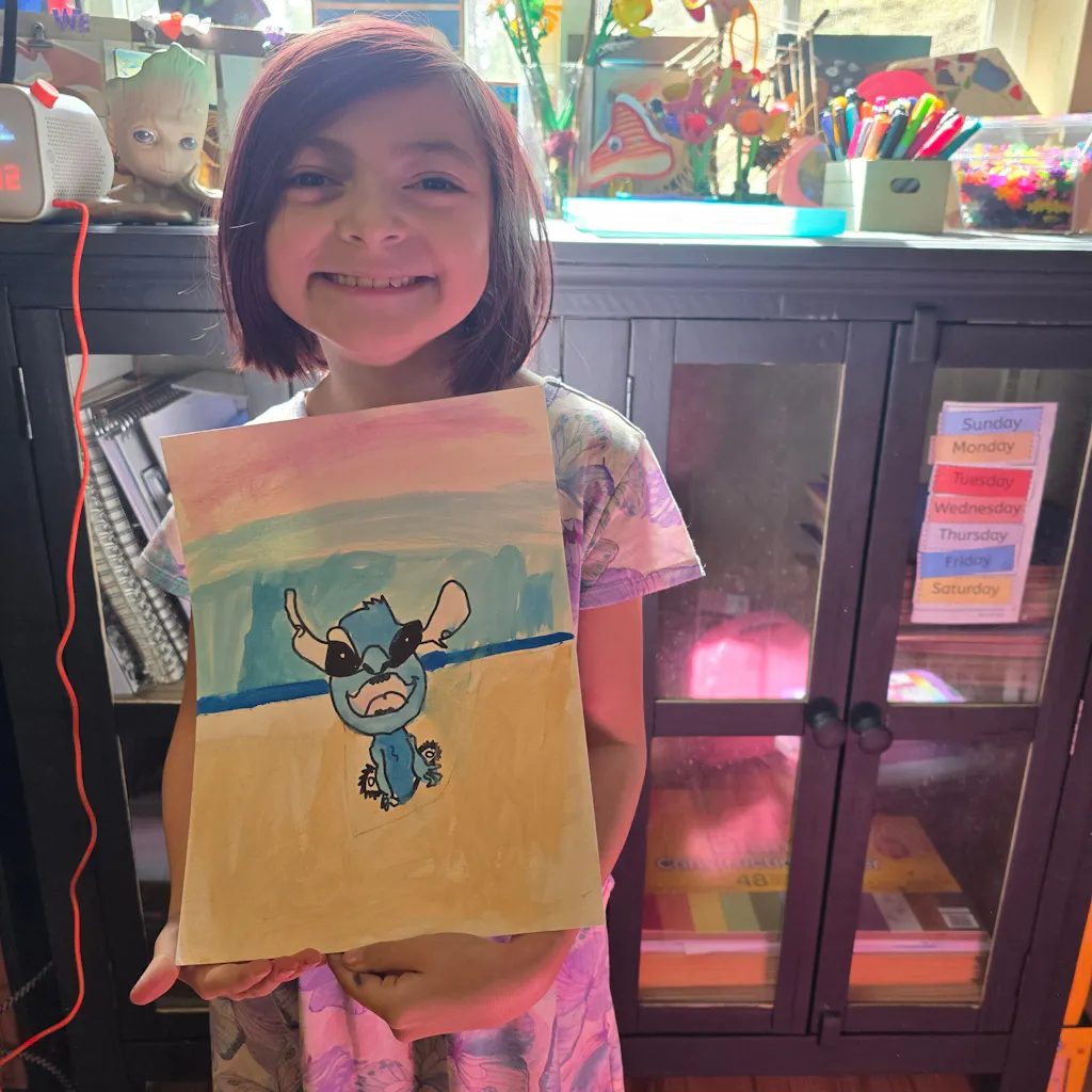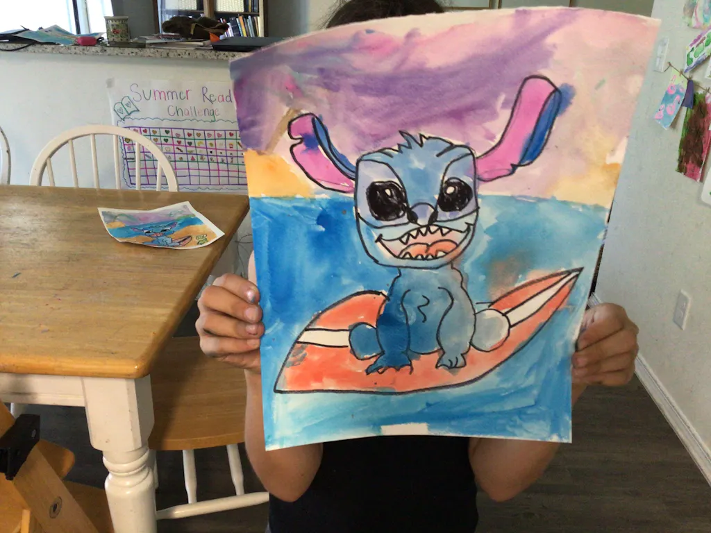 Today we are painting Stitch and singing songs by Elvis Presley! This lesson is a great chance to practice drawing, beach scenes, and movie characters 👽
