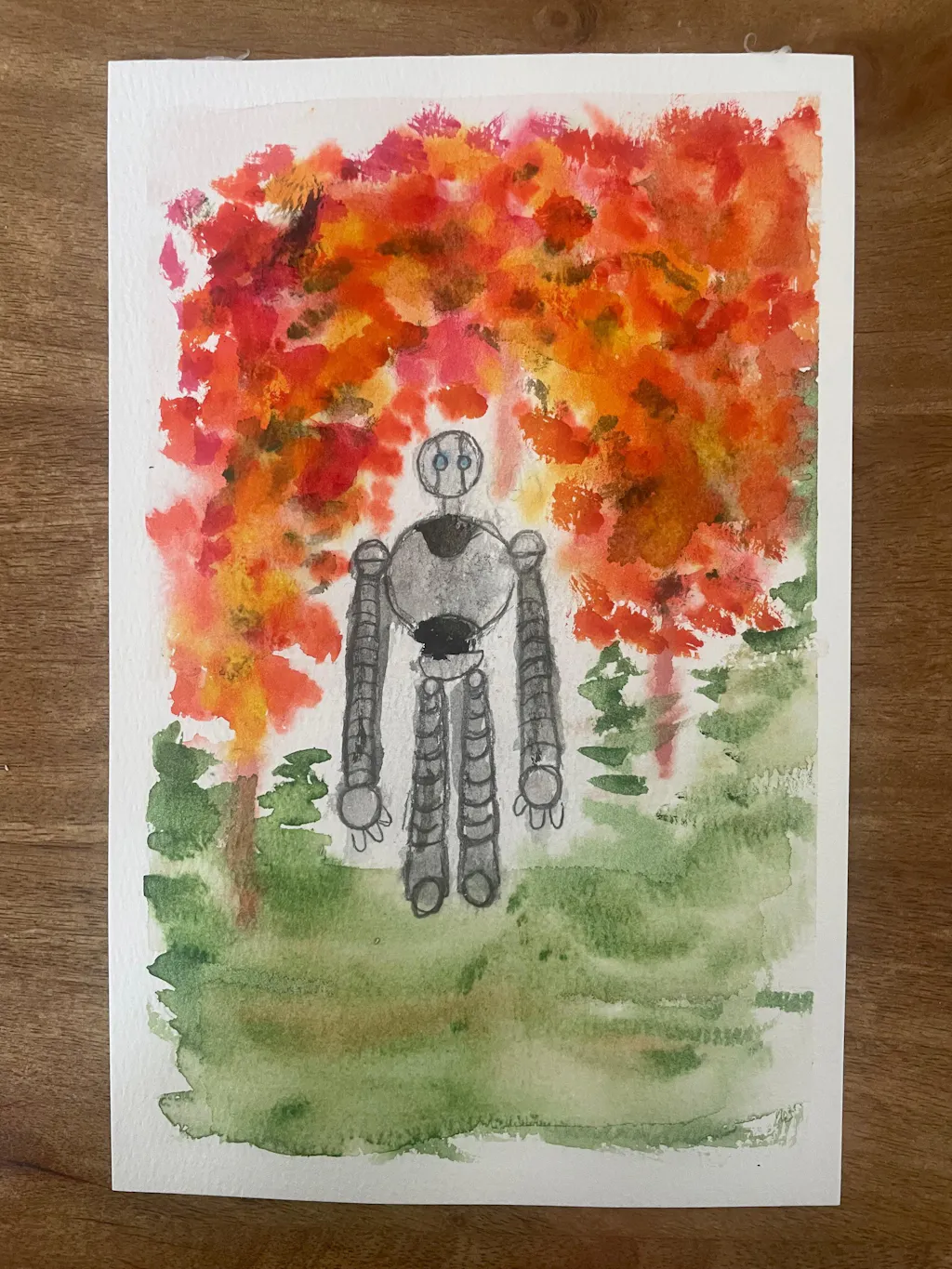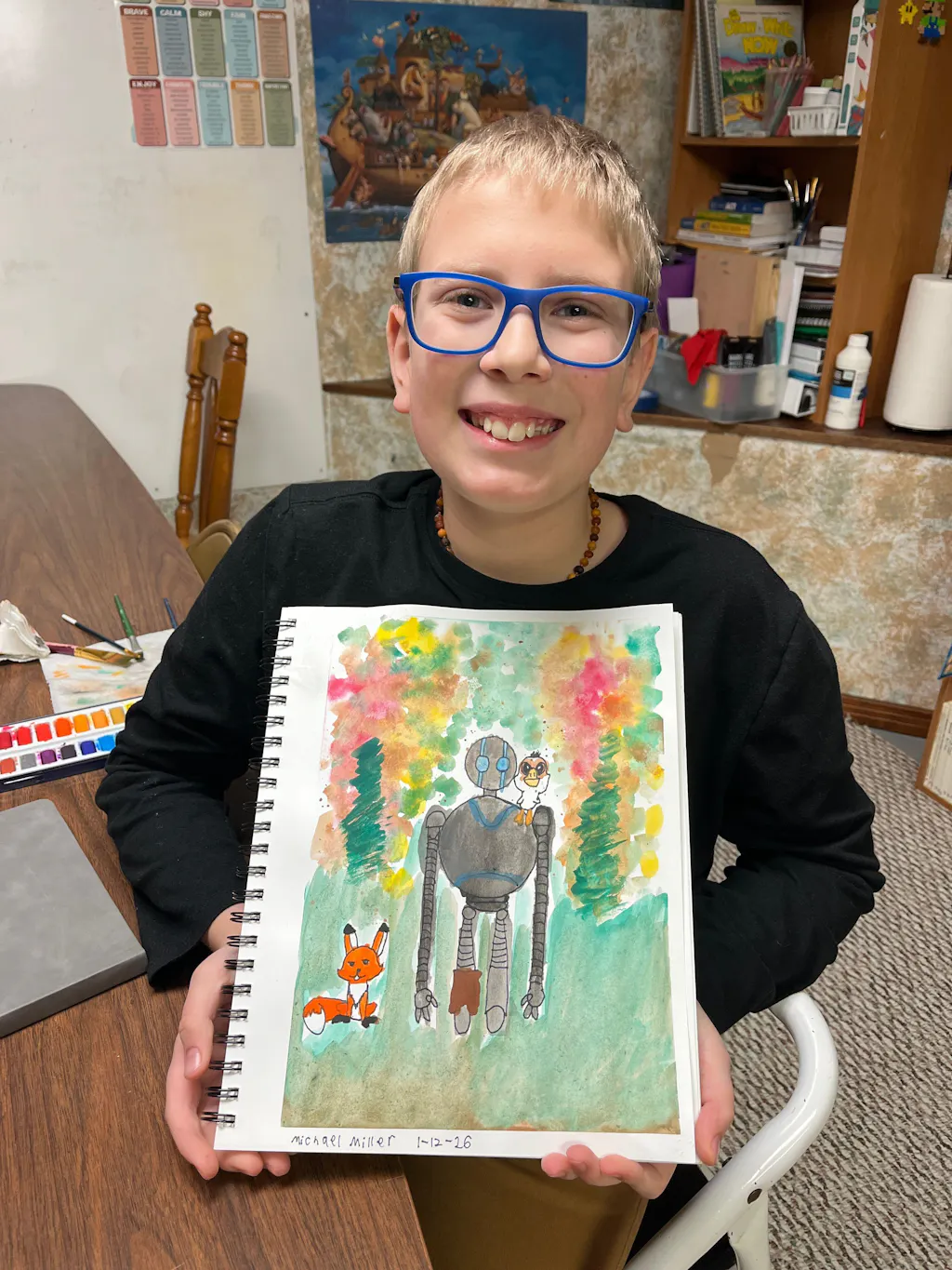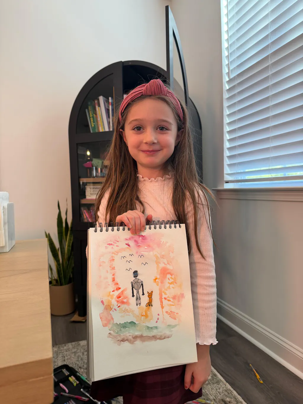 In this adventure we're painting Roz from the Wild Robot! Roz is a helpful and intelligent robot that gets stranded on an island and has to adapt to her surroundings. While there, she makes a few animal friends and helps a young goose learn how to fly. This lesson is a great chance to practice drawing shapes and learn about background vs foreground in a work of art.